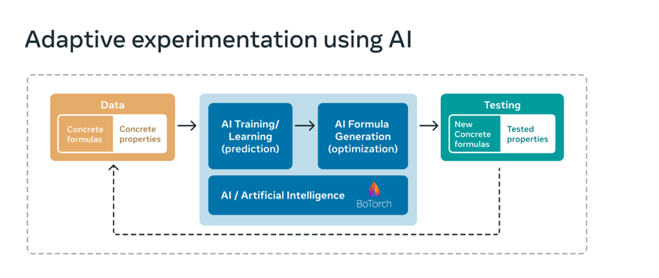 Bu yapay zekâ aracı, Meta’nın BoTorch ve Ax çerçeveleri tarafından desteklenen Bayes optimizasyonundan yararlanıyor ve yüksek performanslı, düşük karbonlu beton keşfini hızlandırmak için Amrize ve Illinois Üniversitesi Urbana-Champaign ile birlikte geliştirildi.